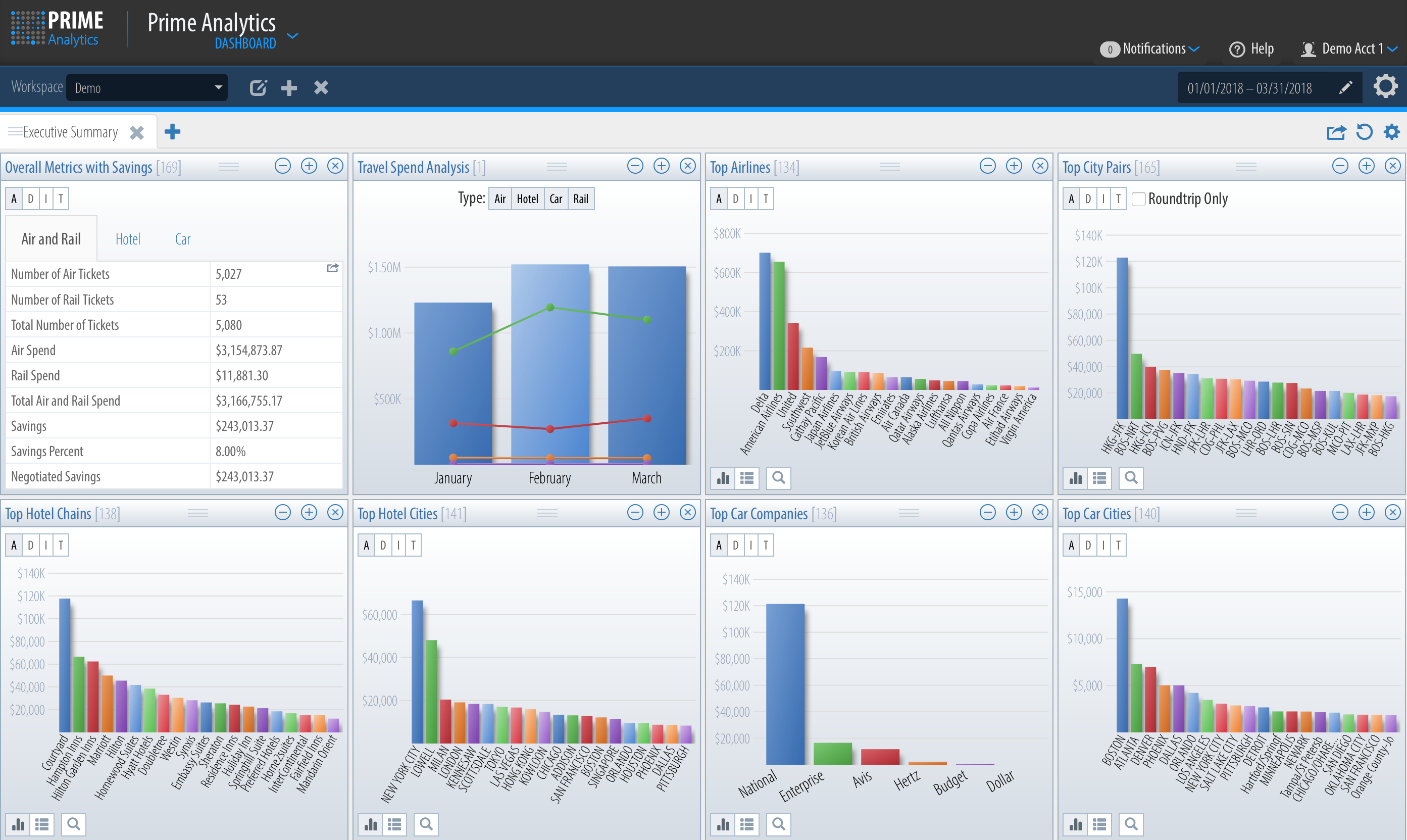 Prime Analytics delivers powerful and actionable data analytics, helping to optimize your company’s travel spend. Our industry-leading data analytics engine provides users with the ability to manage goals, maximize ROI, explore custom analytics, manage suppliers, build presentations, and perform benchmark comparisons against our extensive database. Prime Analytics delivers all the tools you need to effectively report on and manage your company’s travel program! Now includes Insights account review and presentation builder.