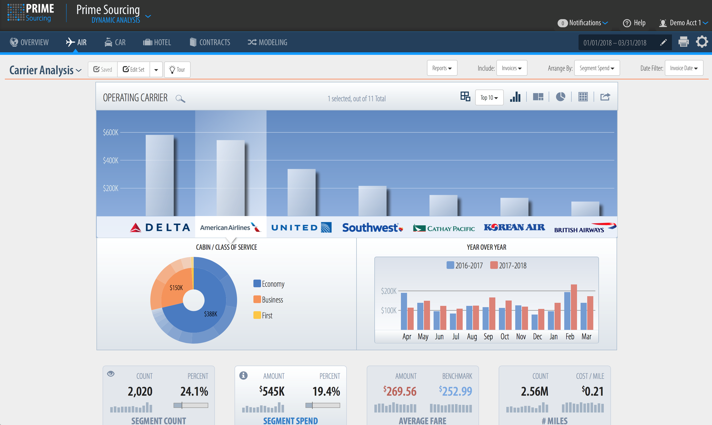 Prime Sourcing provides users with unique and dynamic analytical capabilities to help optimize travel spend, and efficiently conduct sourcing activities. This revolutionary suite of vendor sourcing solutions brings together the full power of business intelligence, rich data visualization, and true ease of use – and replaces the need for countless reports and hours of manual data manipulation traditionally required in the vendor sourcing process. Whether you’re analyzing your company’s spend and market share performance, performing contract utilization and benchmarking breakdowns, or assessing and modeling contract scenarios, Prime Sourcing delivers unparalleled clarity, speed, and insight. Now with Fair Market Share data.